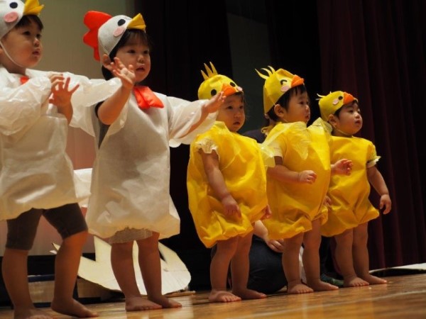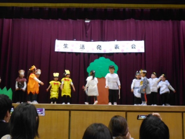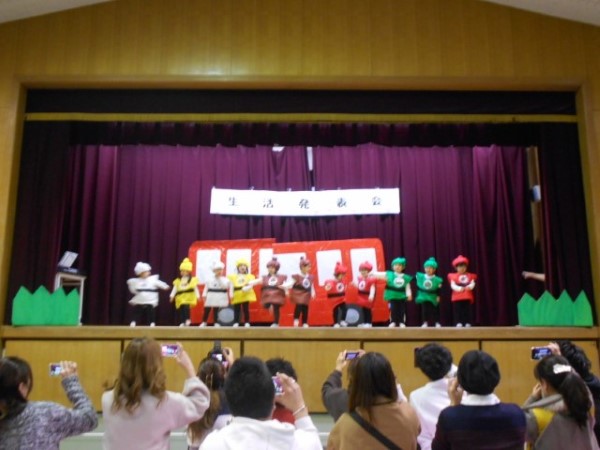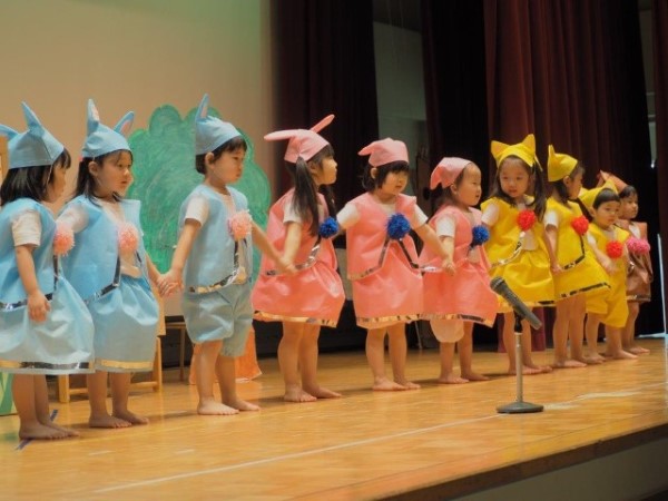 今回初めて楠地区会館の体育室での生活発表会でした。大きな舞台に子どもたちはドキドキと緊張をしていましたが、お遊戯、オペレッタ、劇、楽器演奏などの発表を、たくさんの保護者様の前で精一杯頑張りました。子どもたちの成長がとても感じられた生活発表会となりました。